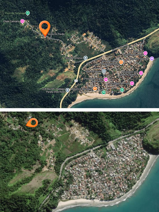 Localizada do outro lado da pista na entrada da Prainha de Mambucaba(Paraty), na Avenida Sítio Senhor Antenor, Gruta do Pavão